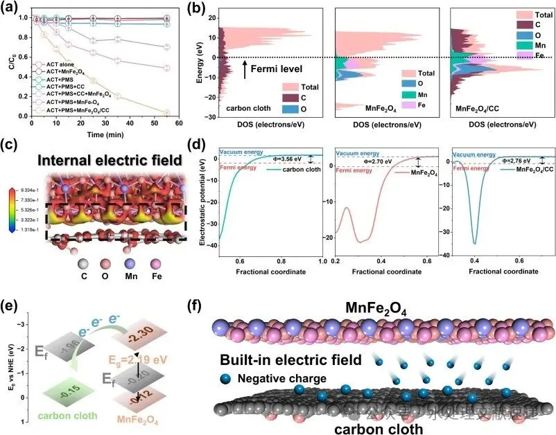 Fig. 2. a) ACT degradation curves in different systems (Conditions: [ACT] = 0.01 g/L, [catalyst] = 0.1 g/L, [PMS] = 0.3 mM, T = 30 °C); b) PDOS of CC, MnFe2O4 and MnFe2O4/CC; c) charge difference distribution at the interface of MnFe2O4/CC, red and yellow indicate charge accumulation and depletion; d) work function of CC, MnFe2O4 and MnFe2O4/CC; e) schematic of electron transfer driven by energy band differences; f) schematic of electron transfer in BIEF. (For interpretation of the references to colour in this figure legend, the reader is referred to the web version of this article.)