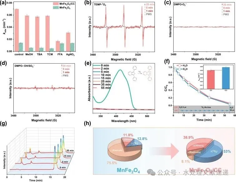 Fig. 3. a) Effects of quenchers on kobs of ACT degradation; b-d) EPR spectra for DMPO−SO4∙-/∙OH, DMPO − O2∙-and TEMP−1O2; e) UV–Vis absorption spectra of DPBF in the MnFe2O4/CC/PMS system (Conditions: [DPBF] = 30 µM, [catalyst] = 0.1 g/L, [PMS] = 0.3 mM, T = 30 °C); f) ACT degradation in D2O and H2O solution by MnFe2O4/CC/PMS system (Conditions: [ACT] = 0.01 g/L, [catalyst] = 0.1 g/L, [PMS] = 0.3 mM, T = 30 °C); g) HPLC curves of typical products generated by the oxidation of FFA in MnFe2O4/CC/PMS system (Conditions: [FFA] = 5 mM, [catalyst] = 0.1 g/L, [PMS] = 0.3 mM, T = 30 °C); h) contribution for ACT degradation by different pathways.