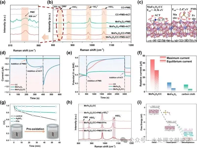 Fig. 4. a, b) In situ Raman spectra; c) DFT calculation of adsorption energies of ACT and PMS on MnFe2 O4/CC; d) i-t curves, and e) OCP curves of CC, MnFe2O4 and MnFe2O4/CC; f) currents of the MnFe2O4/CC, MnFe2 O4, and CC-based GOS systems after adding ACT; g) ACT degradation curves by pre-oxidized catalysts in the presence of quenchers (Conditions: [ACT] = 0.01 g/L, [catalyst] = 0.1 g/L, [quencher] = 5 mM, T = 30 °C); h) in situ Raman spectra after FFA injection; i) Gibbs free energies of PMS* decomposition on the surface of MnFe2O4/CC.