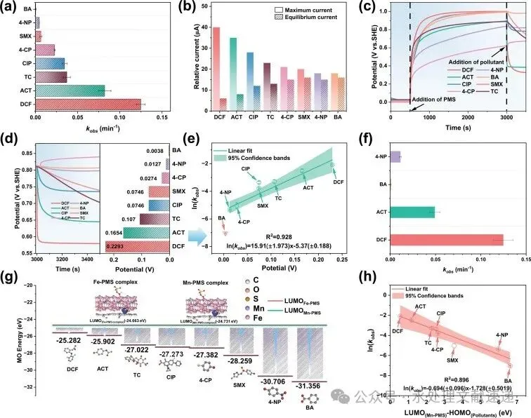Fig. 5. a) kobs values of different pollutants degradation in the MnFe2O4/CC/PMS system; b) currents after adding different pollutants in the MnFe2O4/CC-based GOS system; c) OCP curves and d) falling potentials of the MnFe2O4/CC electrode; e) correlation between the ln(kobs) and the falling potentials; f) kobs in the coexistence of multi-pollutants; g) energy gaps between LUMO of PMS* and HOMO of pollutants; h) correction between the calculated gaps and ln(kobs) of pollutants. Conditions: [pollutant] = 0.01 g/L, [catalyst] = 0.1 g/L, [PMS] = 0.3 mM, T = 30 °C.