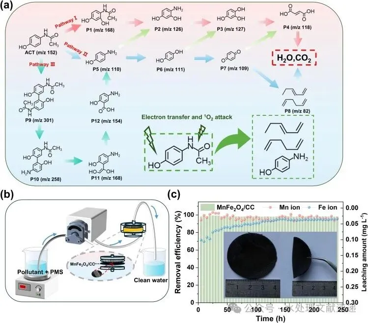 Fig. 6. a) Possible degradation pathways of ACT in the MnFe2O4/CC/PMS system; b) schematic diagram of continuous oxidation system; c) metal ion leaching and degradation efficiency of ACT by the MnFe2O4/CC/PMS continuous oxidation system. Conditions: [ACT] = 0.01 g/L, [catalyst] = 0.1 g/L, [PMS] = 0.3 mM, flow rate = 1 mL min−1 ; temperature = 30 °C.
