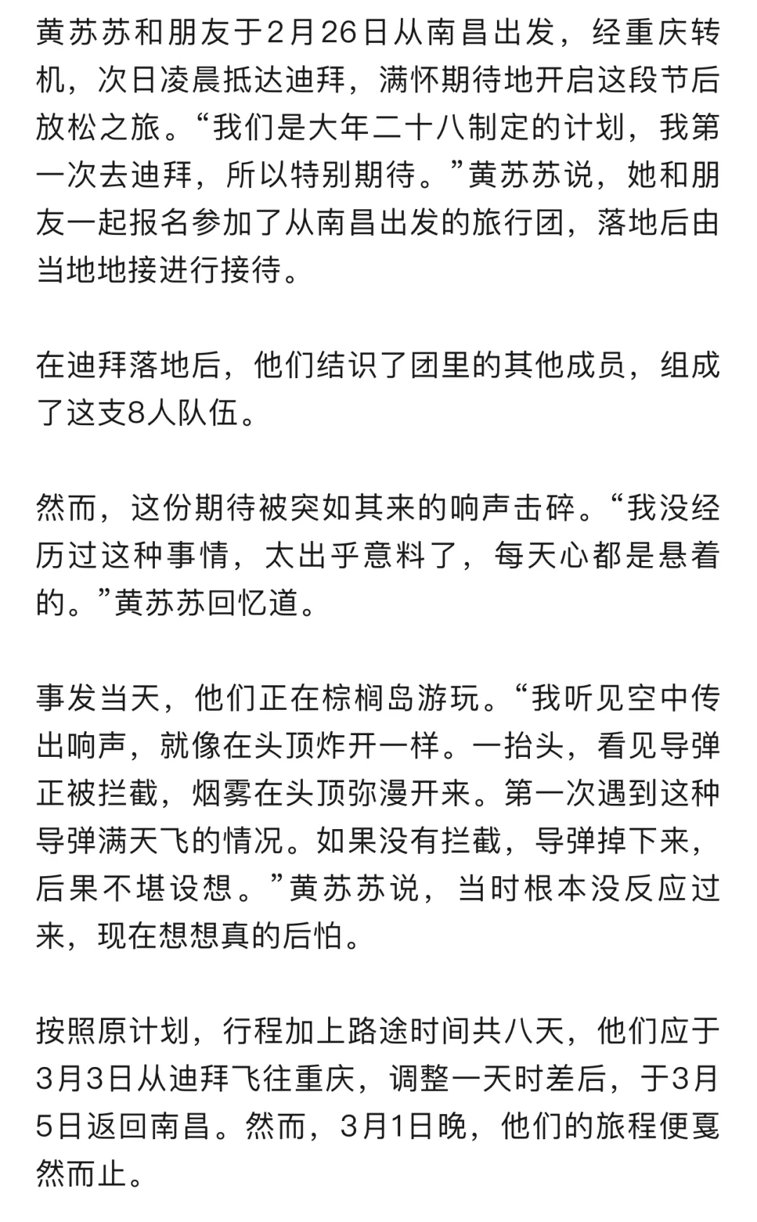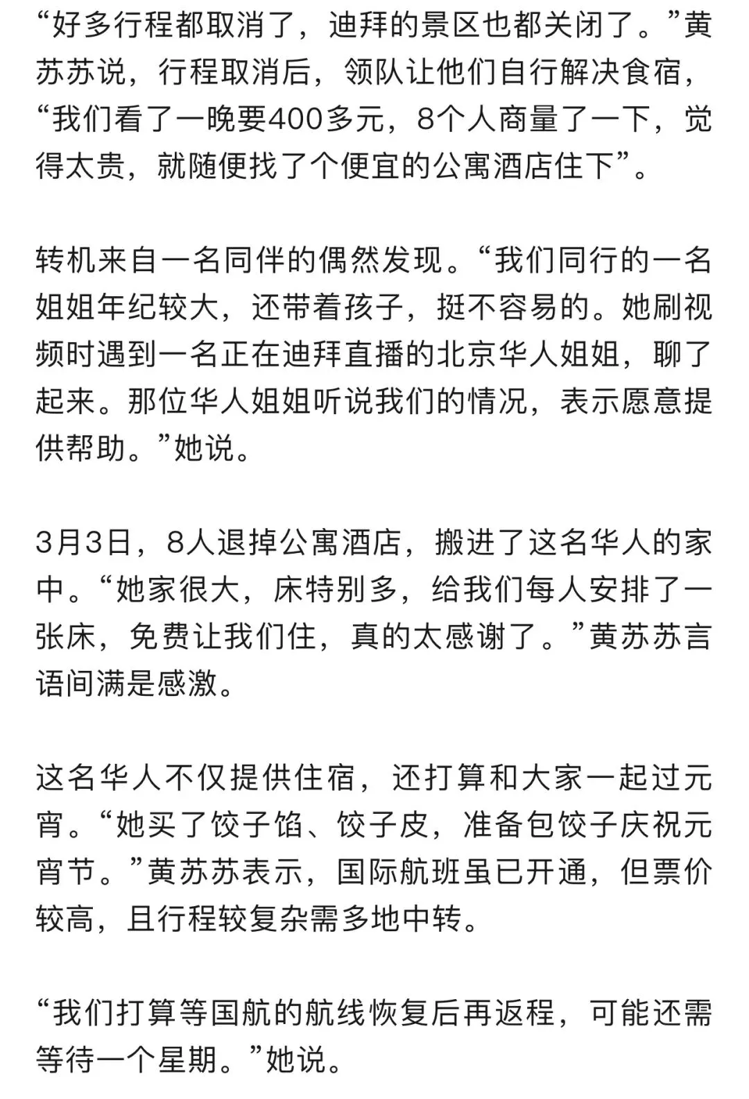3月3日,元宵节。这一天,黄苏苏和她的7名旅伴本应结束8天的迪拜之旅,踏上回国的航班。此刻他们聚集在一名素不相识的华人家里,在距离祖国数千公里的异乡,等待未知的归期。