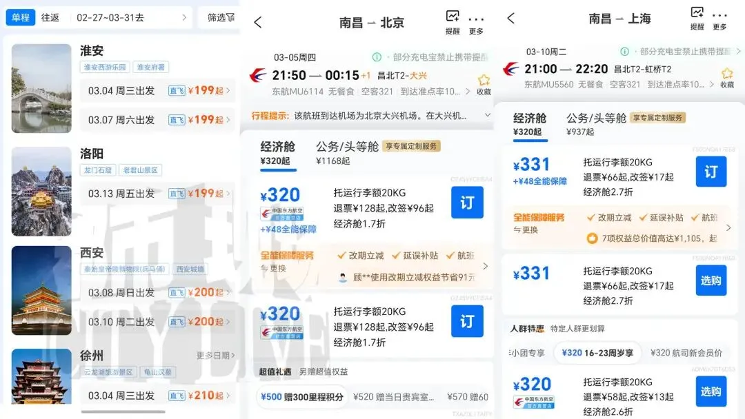 从票价来看,南昌至淮安、西安、洛阳、徐州、日照等城市单程票价低至200元;飞往北京、上海、昆明等中心城市的航线,票价也普遍回落至400元左右区间,整体票价较春节期间下降10%至50%,优惠力度十分可观。