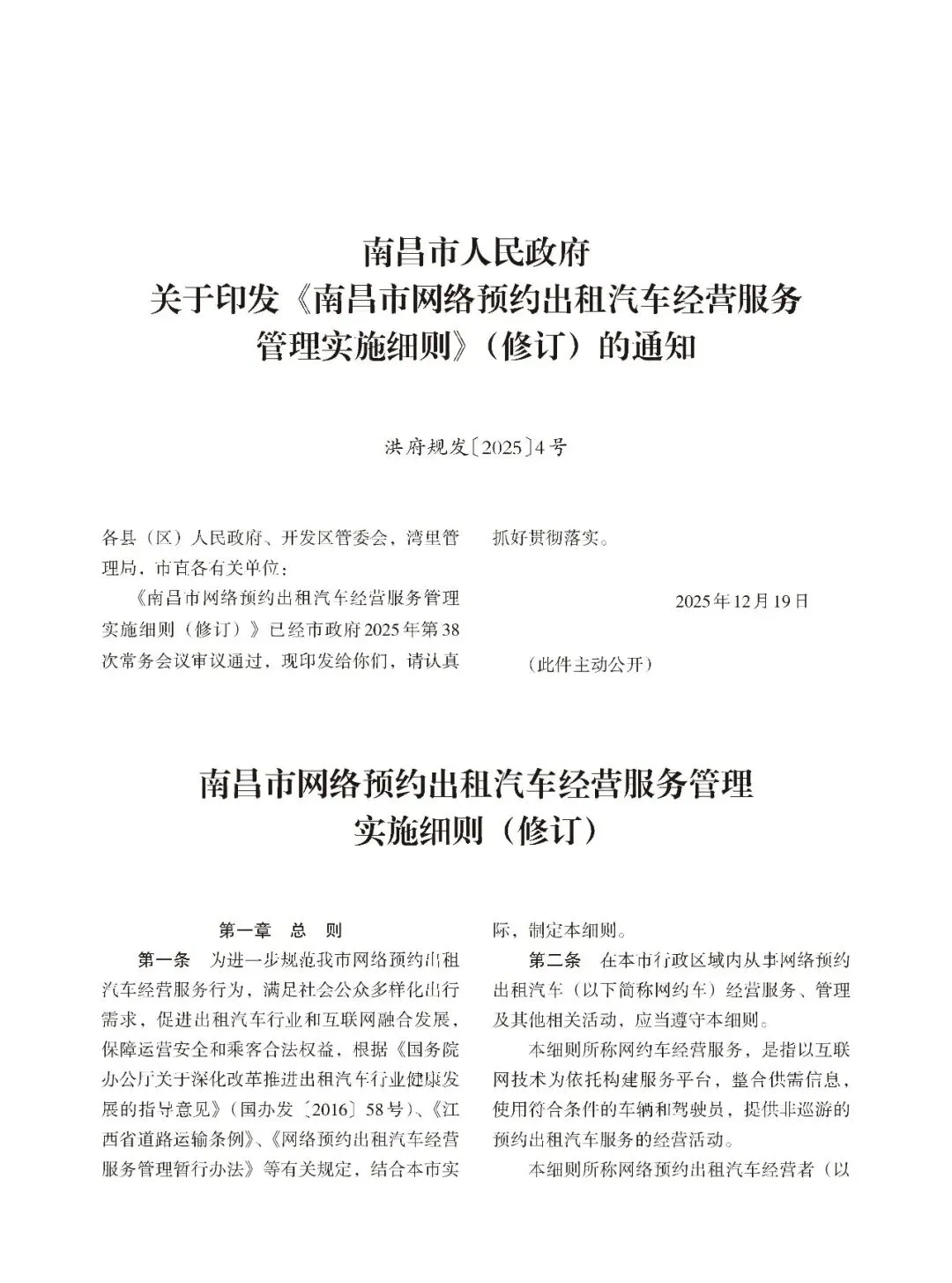>南昌市人民政府关于印发《南昌市网络预约出租汽车经营服务管理实施细则》(修订)的通知