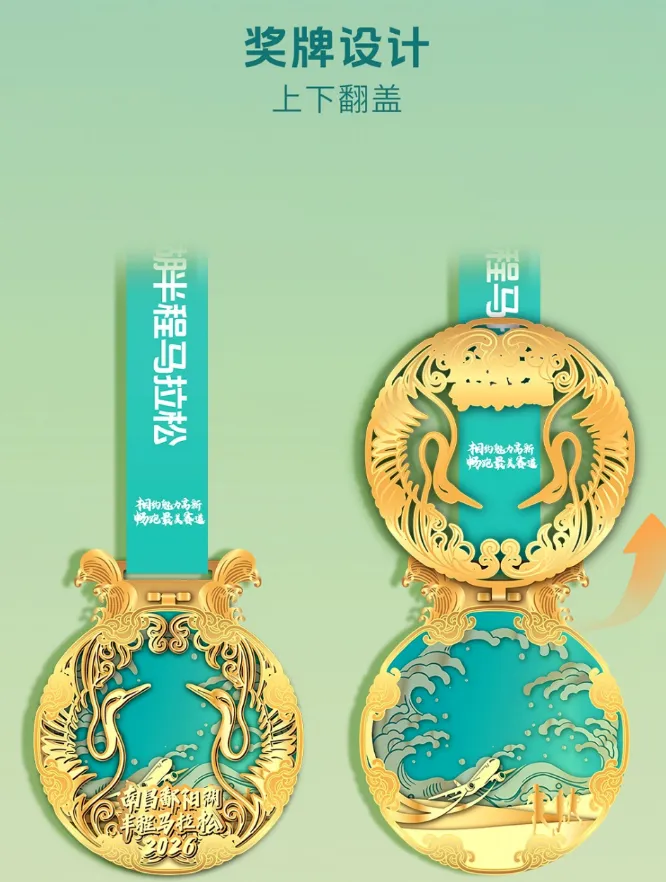 2月28日,南昌鄱阳湖半程马拉松奖牌发布,整体设计是江水的绿色奖牌设计理念:奖牌以“科技高新·鹤舞鄱湖"为核心创作主题,将鄱阳湖的自然生态之美与科技高质量发展(大飞机)深度融合,通过翻盖开启的创新结构,打造出一枚能“互动、可回味”的完赛纪念奖牌。奖牌采用上下翻盖开启关闭的设计,既是视觉亮点,也是体验核心。外层以灵动的镂空线条勾勒出鄱阳湖标志性的候鸟与水翩翩起舞的动态画面,轻盈通透,揭开外层后,鄱湖的科技产业标志性代表元素映入眼帘,此奖牌让完赛纪念不再是冰冷的陈列品,而是一场可以触摸、可以把玩的沉浸式回忆。