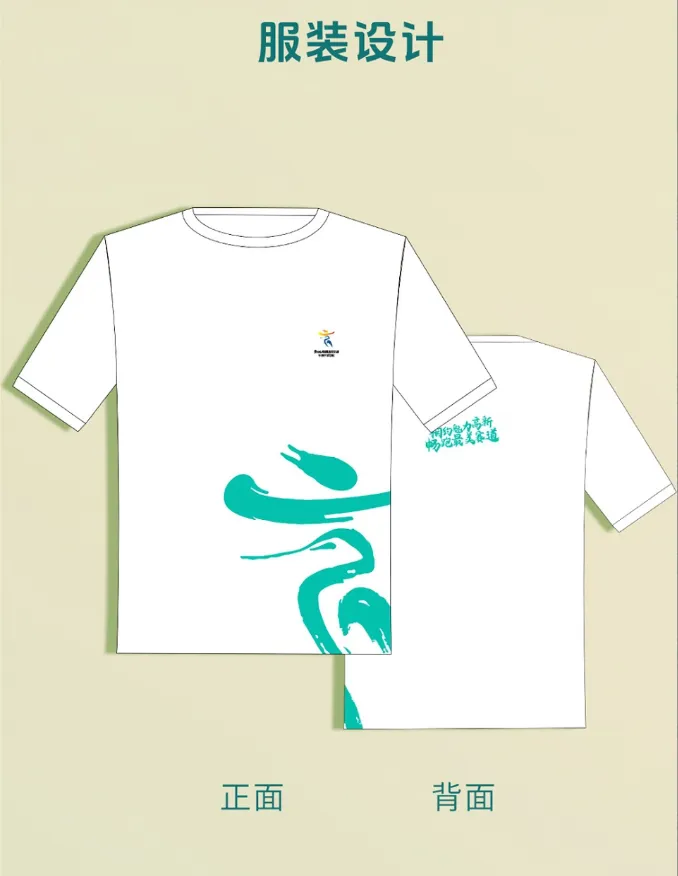 服装设计理念:采用极简主义运动风,以纯白为基底,搭配赛事专属的青绿色作为主视觉色,既保证T恤在日常与赛事场景中的通用性,又通过色彩与符号强化赛事专属感。主题文化与高新LOGO的组合,使T恤成为可移动的赛事宣传载体,提升赛事的曝光度与传播力。