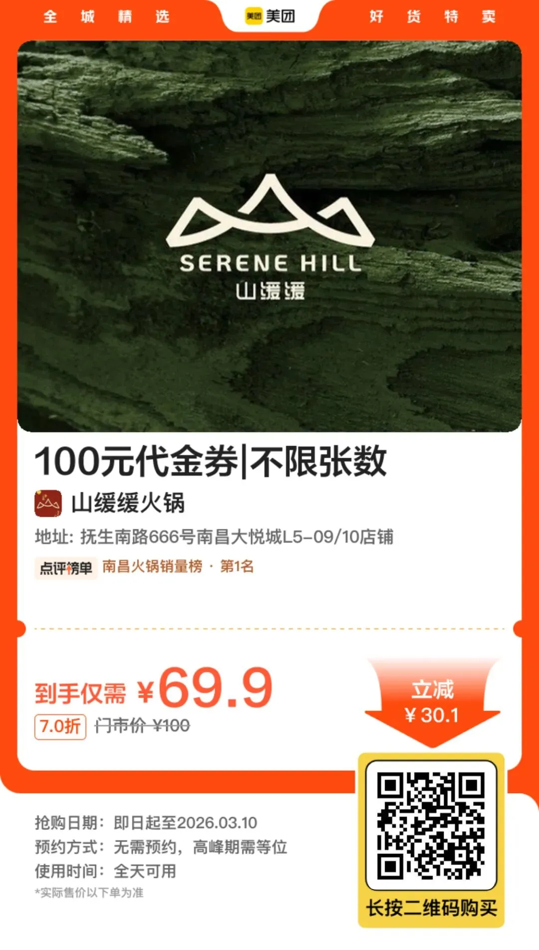 南昌大悦城「山缓缓」优惠券:69抵100可叠加