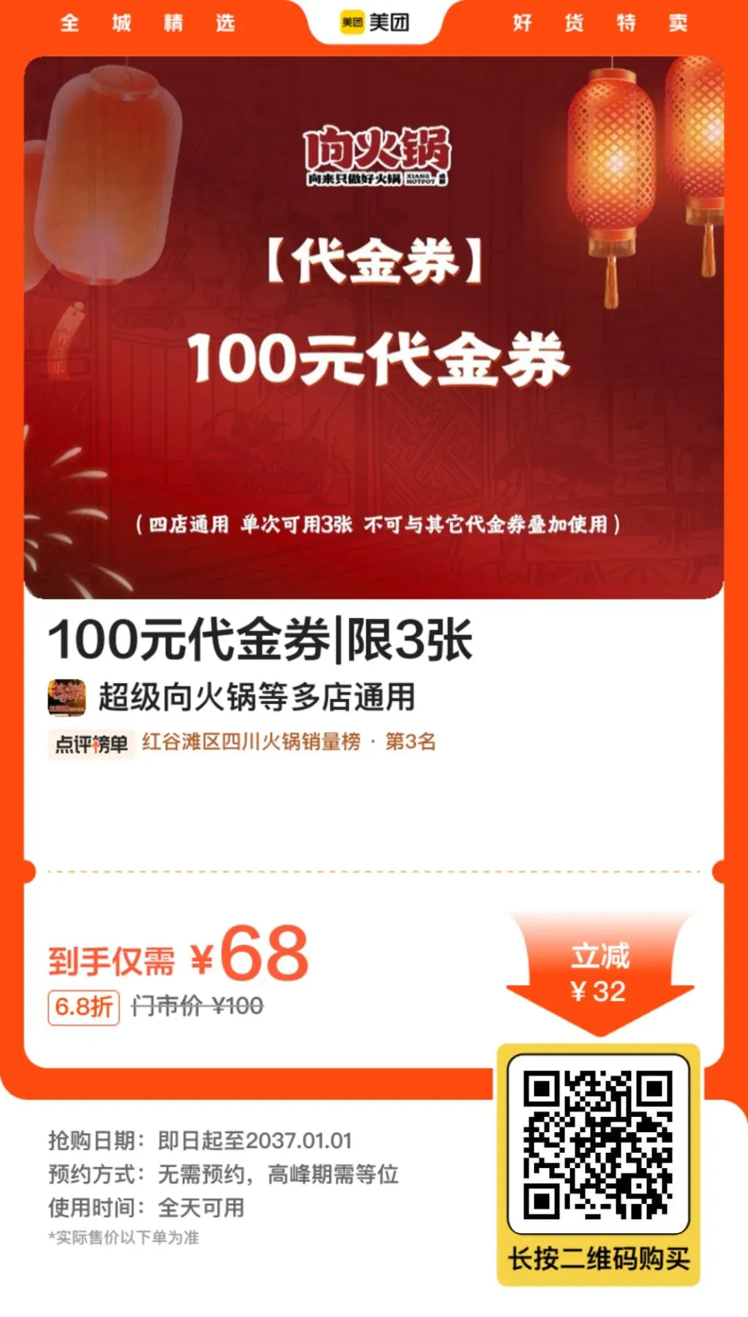 南昌「向火锅」优惠券:68抵100,139抵200,349抵500