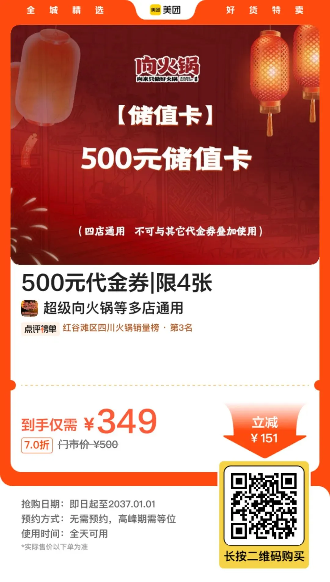 >南昌「向火锅」优惠券:68抵100,139抵200,349抵500