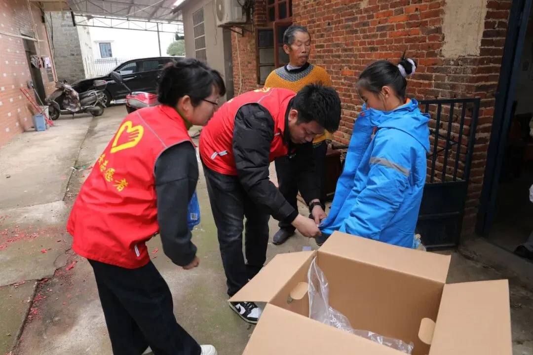 集中发放结束后,志愿者们发现还有3个特别的孩子。为了让这份温暖“一个都不能少”,在杨墟镇团委书记的带领下,志愿者们抱起温暖包,踏上了乡间的小路来到孩子的家中,在他们家中,志愿者蹲下身,为他换上崭新的冲锋衣,尺码刚刚好。每到一户,志愿者都会和孩子聊聊天,问问学习情况,记下他们的小心愿。
