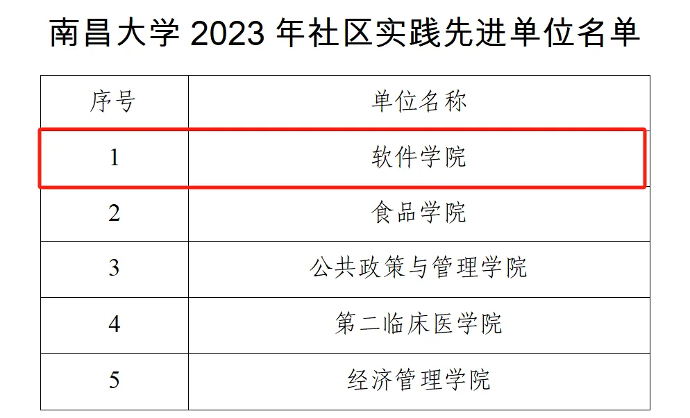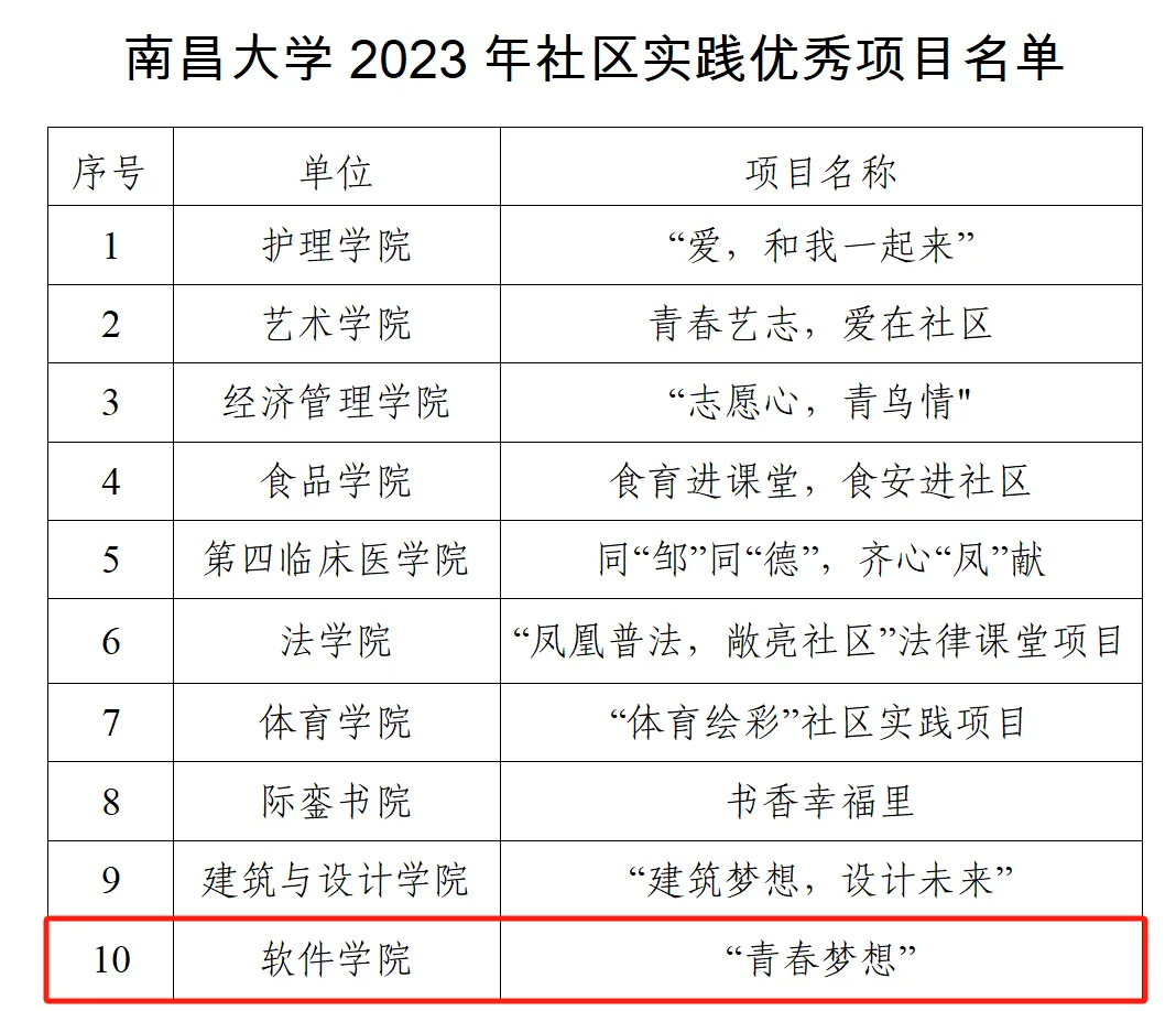 自2023年3月大学生社区实践计划实施以来,各学院积极建设社区实践基地,精心组织开展社区实践活动,取得了较好的工作成效。为进一步树立典型、表彰先进,经南昌大学2023年大学生社区实践计划评审会评审,并结合具体实践情况,授予软件学院等5个单位“南昌大学2023年社区实践先进单位”的荣誉,并授予软件学院“青春梦想”等10个项目“南昌大学2023年社区实践优秀项目”的荣誉称号。