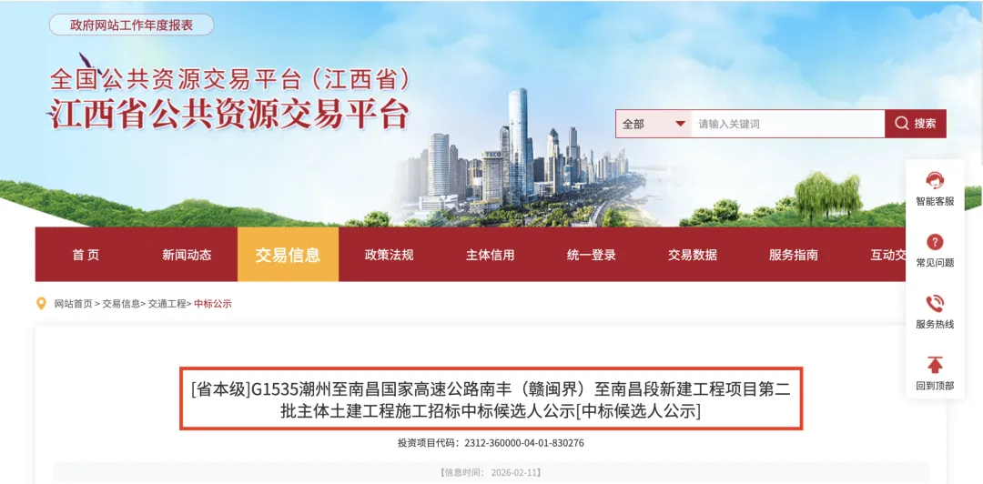 2026 年 2 月 11 日,江西省公共资源交易平台正式公示 G1535 潮州至南昌国家高速公路南丰(赣闽界)至南昌段新建工程项目第二批主体土建工程施工招标中标候选人,5 个标段全部敲定,合计中标金额约 57.4 亿元。此次定标覆盖项目中段至北段核心土建范围,标志着这条总投资 224.96 亿元的国家级高速,进入实质性施工落地阶段。 项目概况