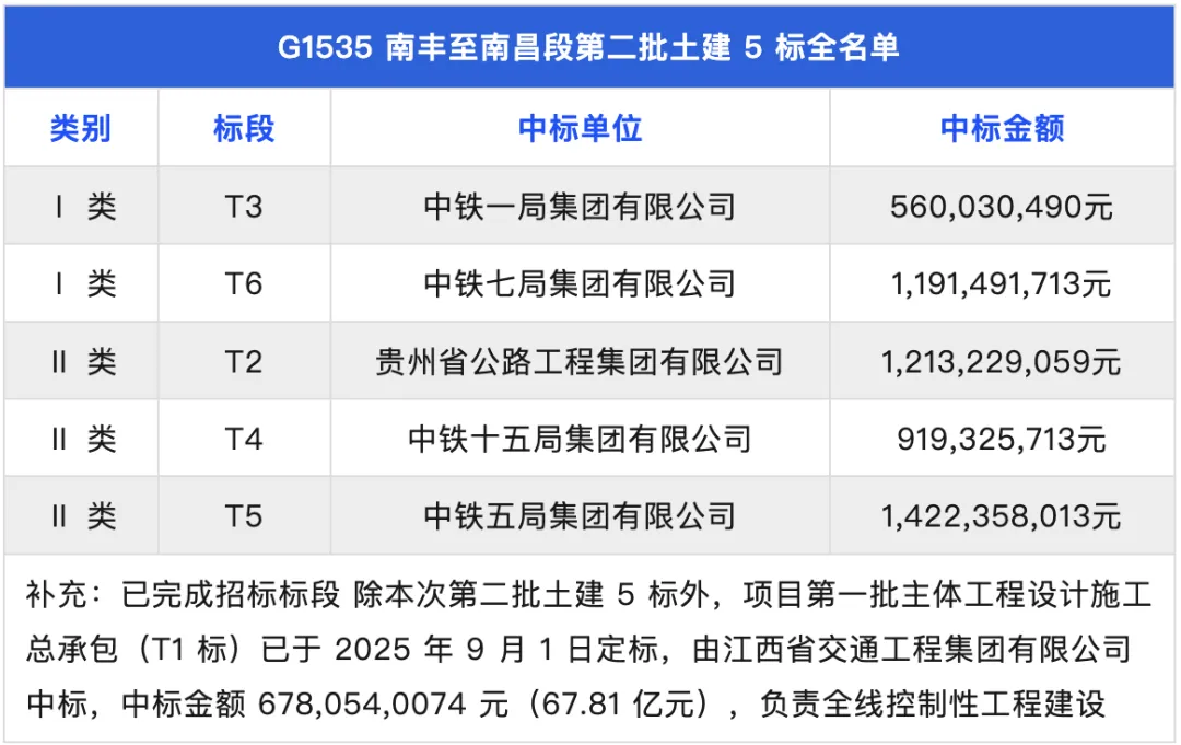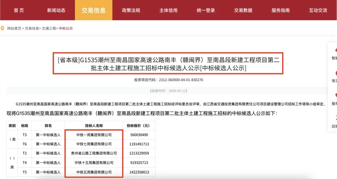 项目名称:G1535 潮州至南昌国家高速公路南丰(赣闽界)至南昌段新建工程建设内容:起于抚州市南丰县太和镇樟坊村赣闽交界处,途经南丰、南城、宜黄、崇仁、临川、丰城、南昌县,终于 G6001 南昌绕城高速八一互通。 路线全长 206.113 公里,双向四车道高速公路标准,设计时速 100 公里,路基宽 26 米,汽车荷载等级公路 - I 级。本次招标范围:K97+341.367 至 K164+524.865、K164+905 至 K207+194.104 桩号范围,含路基、桥梁、涵洞、防护排水、路线交叉、环保绿化、交安设施、管道工程、声屏障及附属路面工程等。本次第二批主体土建工程划分为 Ⅰ 类(纯路基)、Ⅱ 类(路基 + 路面)2 个类别,共 5 个标段,以下为第一中标候选人完整信息,均来自官方公示: 未开标 / 即将招标标段