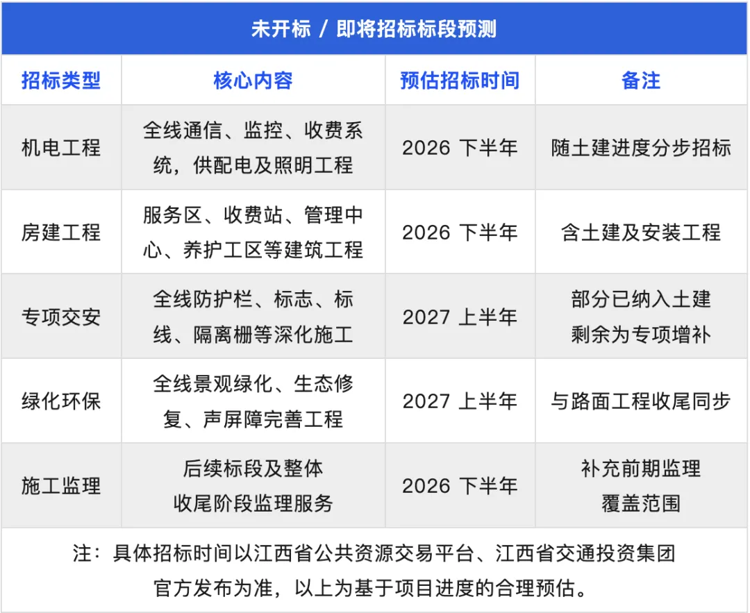 结合项目招标计划及高速工程建设常规流程,截至 2026 年 3 月 4 日,以下标段尚未发布招标公告,均为必招核心内容,建议工程同行重点关注: