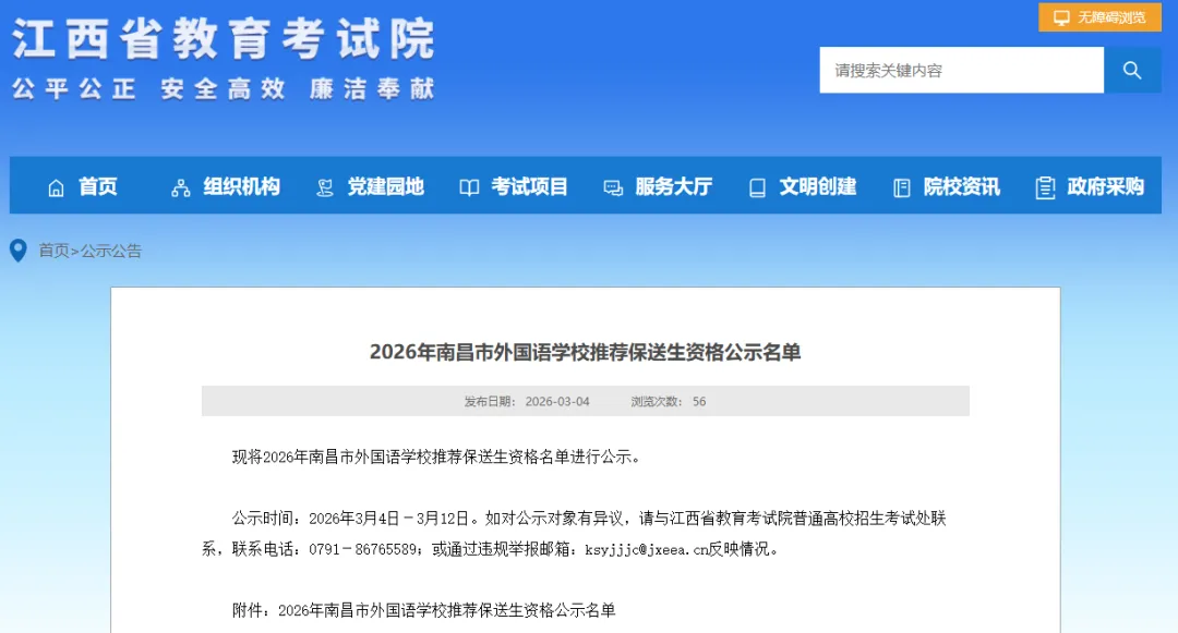 公示时间:2026年3月4日-3月12日。如对公示对象有异议,请与江西省教育考试院普通高校招生考试处联系,联系电话:0791-86765589;或通过违规举报邮箱:ksyjjjc@jxeea.cn反映情况。