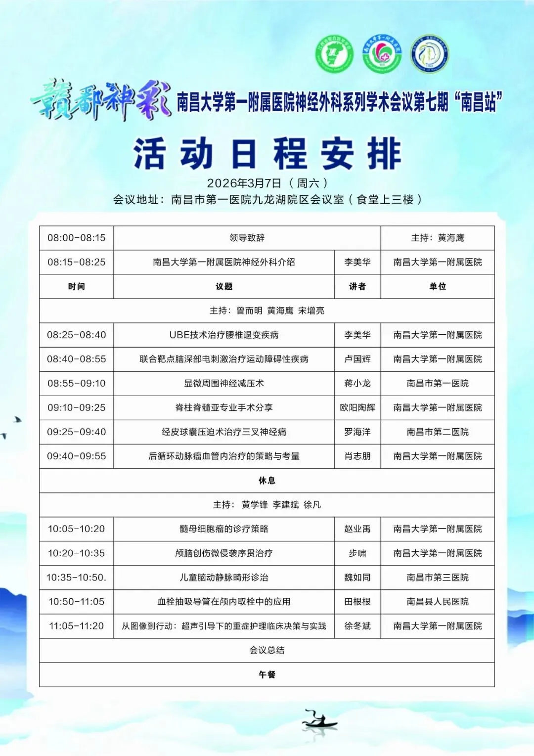 由江西省整合医学学会主办,江西省整合医学学会神经外科分会、江西省神经疾病医疗中心、江西省神经系统疾病重点实验室、南昌大学第一附属医院神经外科承办,南昌市第一医院神经外科协办的“赣鄱神彩”南昌大学第一附属医院系列学术论坛第七期“南昌站” ,将于2026年3月7日在南昌市举办。