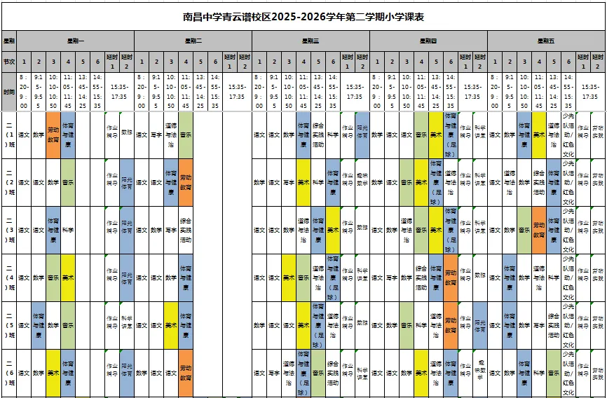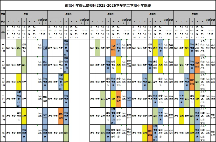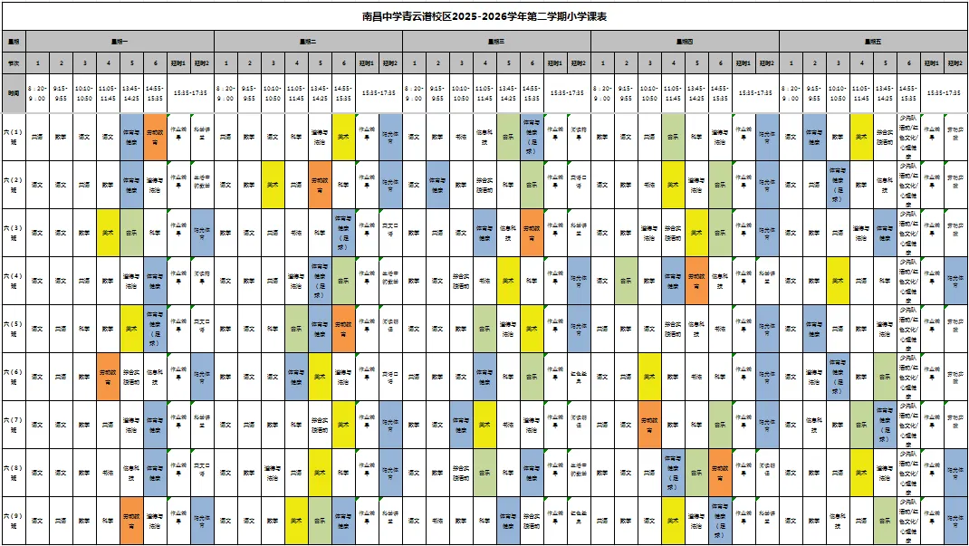 学校严格遵循国家课程方案和课程标准,开齐开足上好体美劳课程:保障每天1节体育课,确保学生每日校内体育活动时间不少于2小时;美育课程涵盖音乐、美术等多领域,激发学生艺术兴趣与创新意识;劳动教育每周不少于1课时,并强化课外实践体验,培养学生劳动习惯与技能。坚决做到不减少、不挤占体育、美育、劳动教育课时,持续推动“双减”政策落地见效。南昌中学教育集团青云谱校区积极整合集团优质资源,共建教师发展共同体,共研特色课程,助力学生全面成长。现根据要求,向社会及家长公示课程表,欢迎监督。