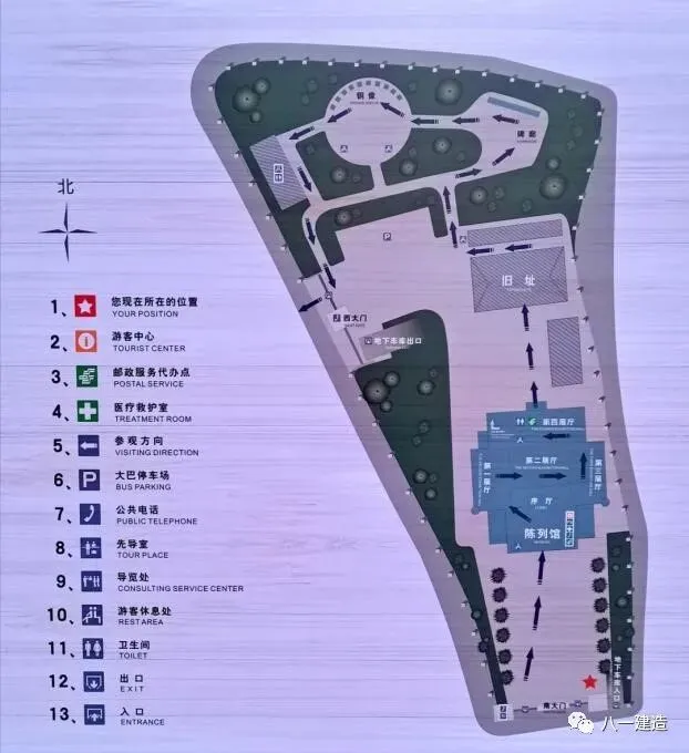 从旧址西边的牌楼走出,西北面是一片开阔的绿地石路,这里便是占地20亩的铁军广场。