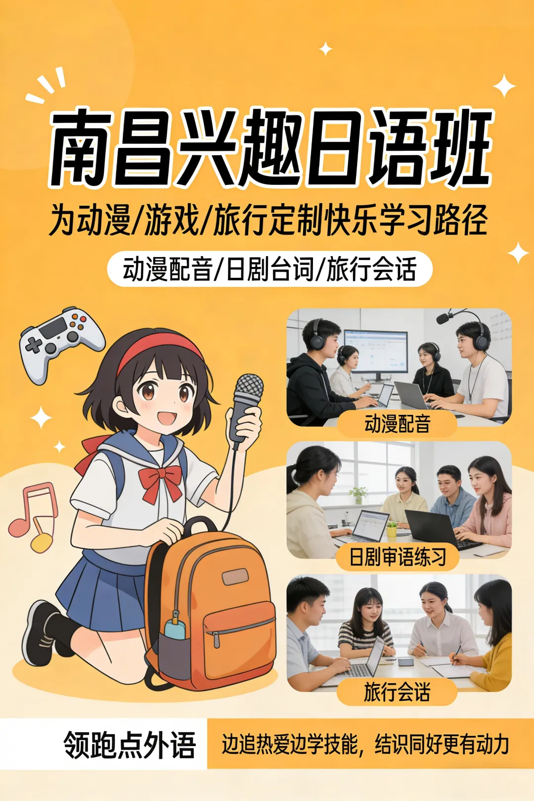 在南昌,越来越多的年轻人不再满足于“为考试而学”的外语模式,而是渴望用语言打开一扇通往热爱的大门。领跑点外语推出的兴趣日语班,正是为这样的你量身打造——它不只是一门语言课,更是一场沉浸式的文化体验,让你在动漫、游戏、旅行的场景里,边追热爱边学技能,结识同好更有动力。