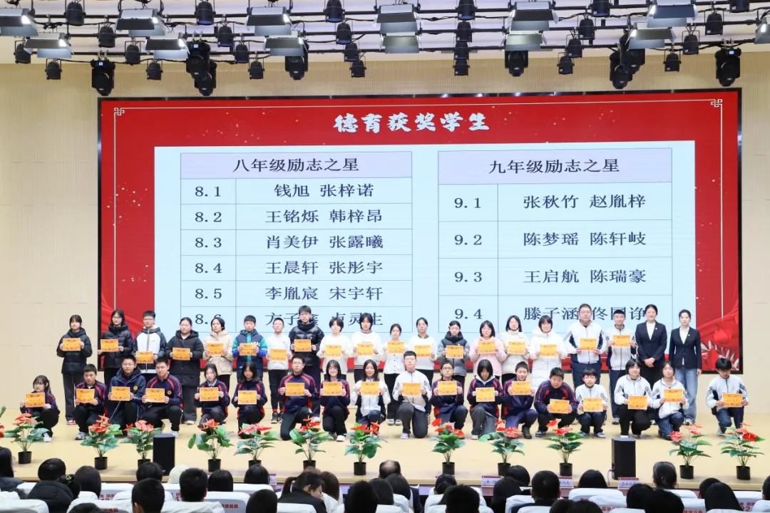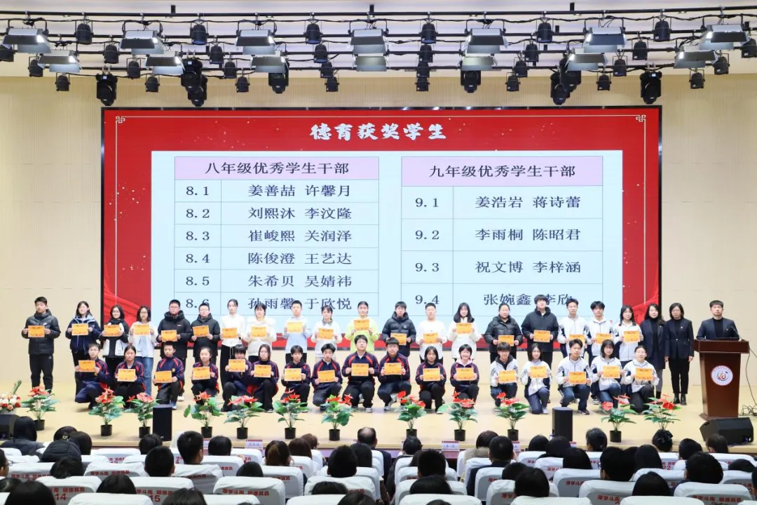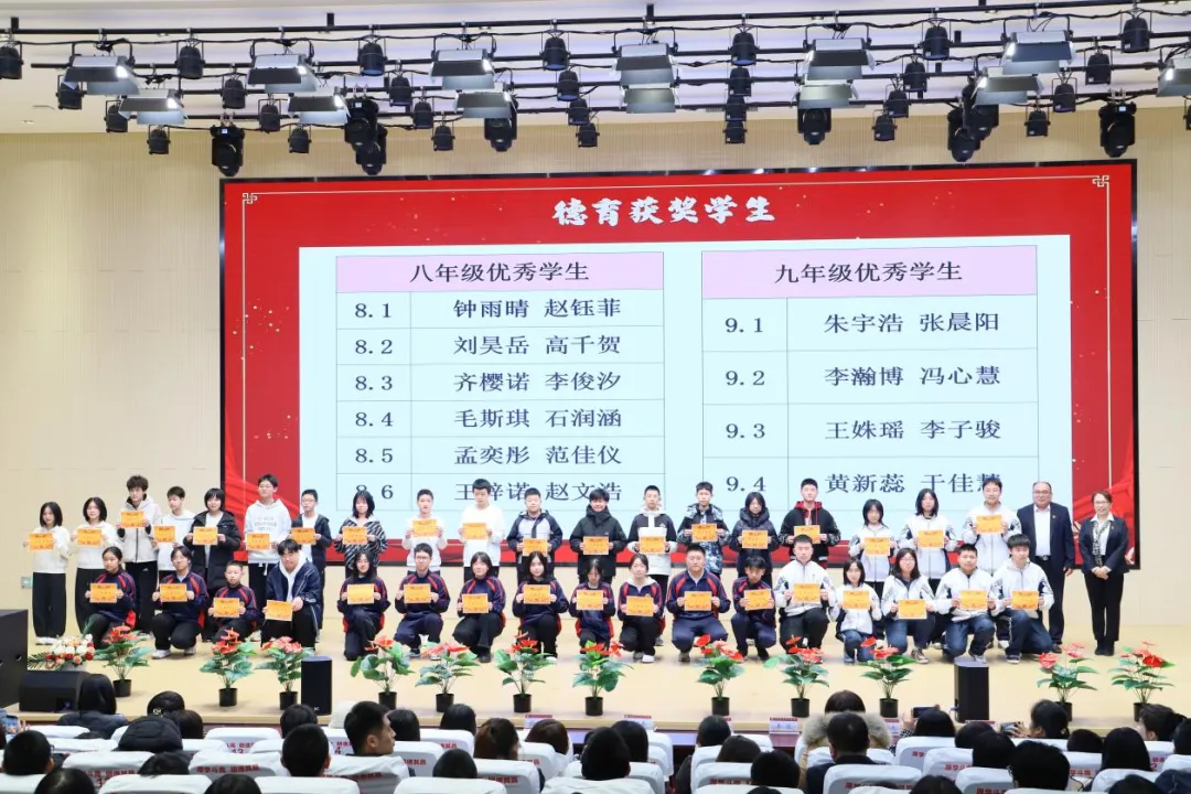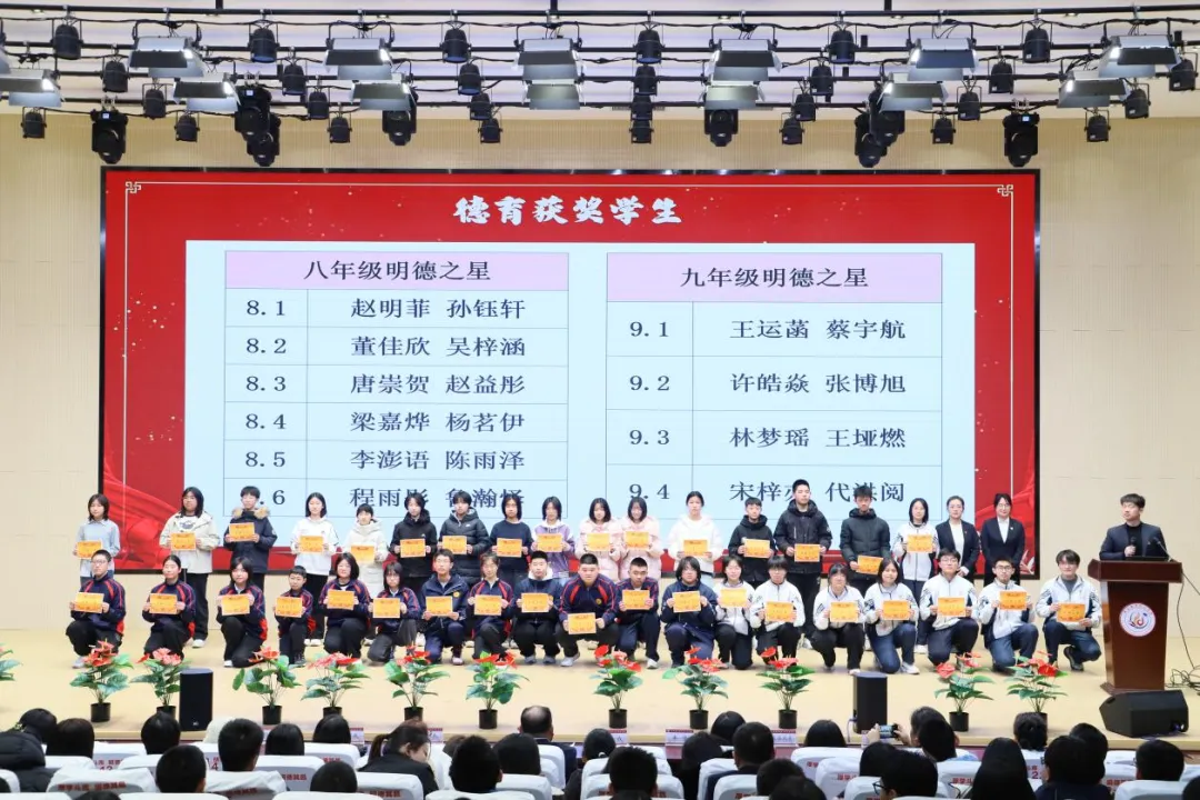 表彰先进,致敬榜样;以点带面,共促成长。德育颁奖环节,德育主任孟庆瑜主任宣读了优秀学生、明德之星等获奖名单,校领导为获奖代表颁发荣誉证书并合影留念。一张张荣誉证书,是对学子们过往努力的最好嘉奖,更是对全体同学的激励与鞭策,希望每一位同学都能以榜样为标杆,见贤思齐、奋勇争先。