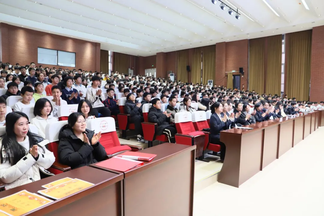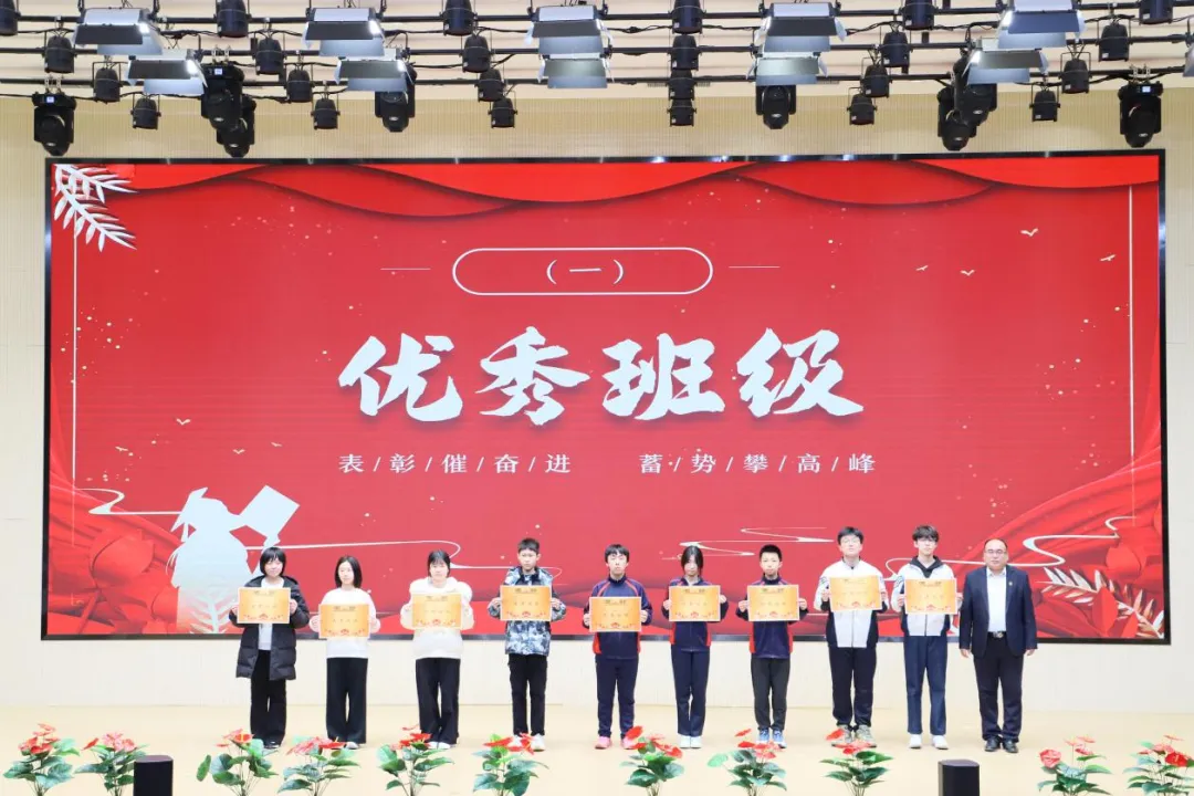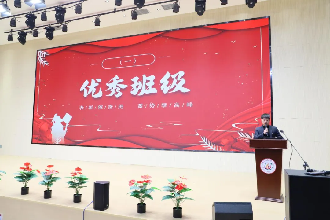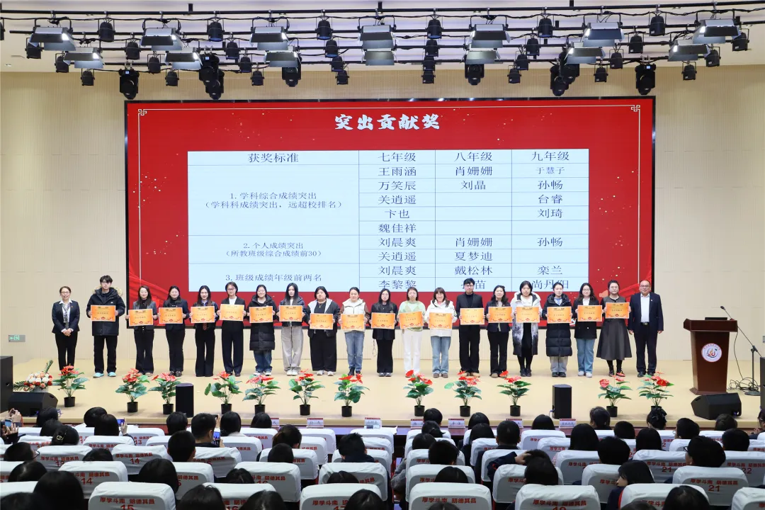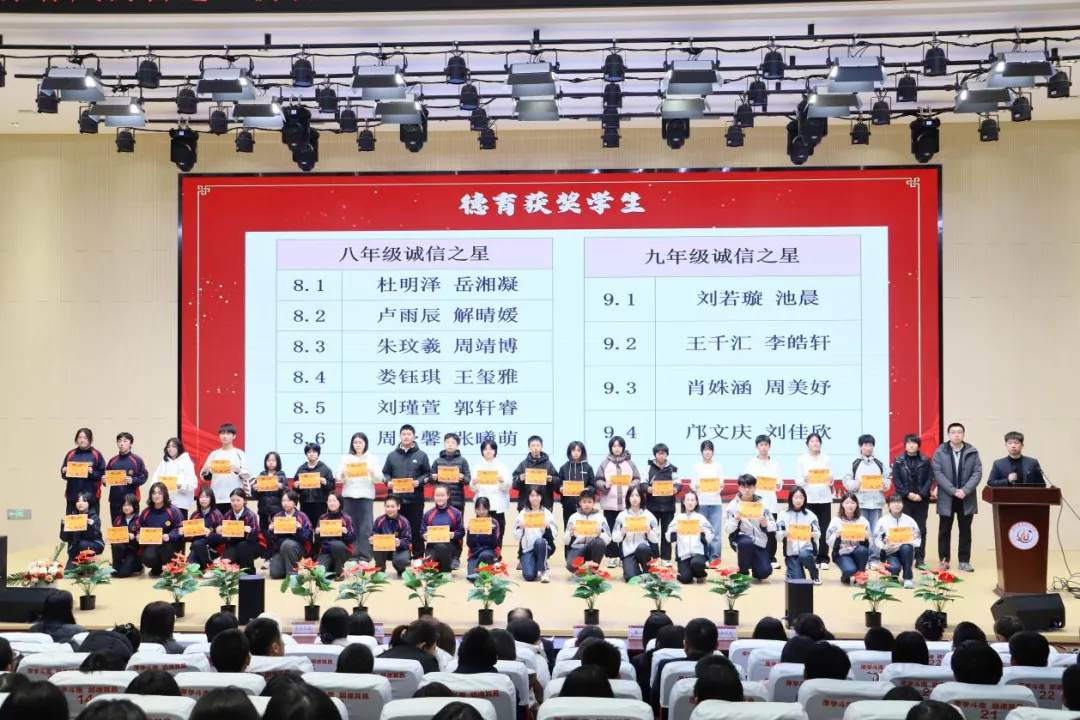 表彰先进,致敬榜样;以点带面,共促成长。德育颁奖环节,德育主任孟庆瑜主任宣读了优秀学生、明德之星等获奖名单,校领导为获奖代表颁发荣誉证书并合影留念。一张张荣誉证书,是对学子们过往努力的最好嘉奖,更是对全体同学的激励与鞭策,希望每一位同学都能以榜样为标杆,见贤思齐、奋勇争先。
