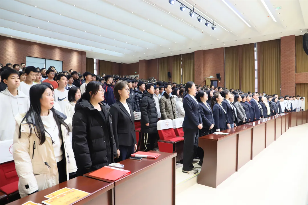 伴随着激昂的背景音乐,全体师生起立,高唱国歌,嘹亮的歌声响彻报告厅,爱国情怀在每个人心中激荡,奋进的信念在这一刻悄然扎根。