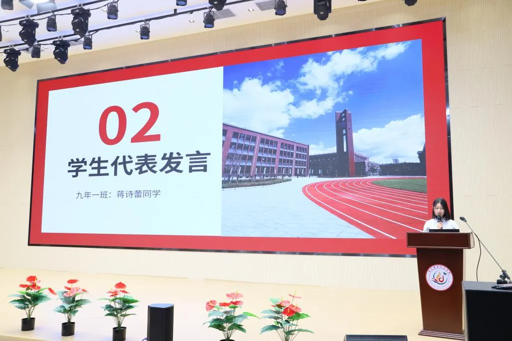 少年有志,笃行不怠;初心如磐,方得始终。九年级1班蒋诗蕾同学作为学生代表登台发言,她以青春的视角,分享了自己的成长感悟,表达了新学期的奋斗决心。“勤学笃行,不负韶华;脚踏实地,共赴新程”,她的话语铿锵有力、掷地有声,呼吁全体同学以崭新的姿态、昂扬的斗志,珍惜时光、奋力拼搏,在青春的赛道上书写属于自己的精彩。