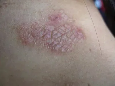 牛皮癣:主要表现为红斑、鳞屑,红斑上覆盖有多层银白色鳞屑,刮除鳞屑后可见薄膜现象及点状出血。红斑大小不一,形态多样,可呈点滴状、斑块状、地图状等。鳞屑较厚,呈银白色,轻轻刮除鳞屑后,可见淡红色发亮的半透明薄膜,再刮薄膜则有点状出血。瘙痒程度较轻,常伴有指甲病变。