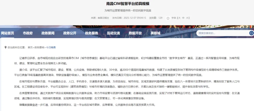 南昌市CIM基础平台已通过省级验收,成功搭建起覆盖全市的数字孪生城市基底,为城市运营管理提供统一空间数字底座。该平台汇聚6大类逾2000个图层数据,构建七级精细三维数字体系,具备海量数据渲染、物联设备接入等核心能力。其已在规划更新、工程审批、房屋管理、交通文旅等多场景落地应用,未来还将在应急管理、公共服务等领域释放更大数字效能。
