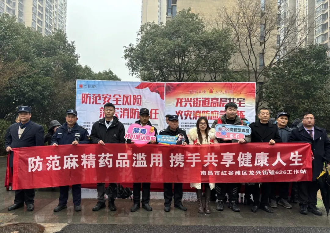 红谷滩区龙兴街道6.26工作站联合龙兴街道房管所、应急办,在新力龙湾社区开展消防演习和禁毒宣传安全教育活动。