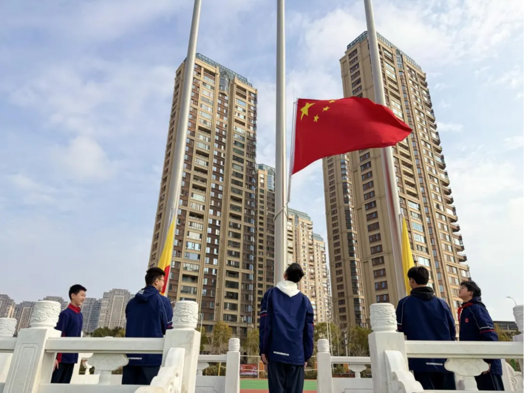 伴随着雄壮嘹亮的《义勇军进行曲》,五星红旗冉冉升起、迎风飘扬,全体师生行注目礼、齐声高唱国歌,赤诚的爱国情怀在校园上空久久回荡。随后,校旗缓缓升起,悠扬悦耳的校歌响彻全场,每一位博雅学子心中都涌动着对校园的热爱与对未来的憧憬。
