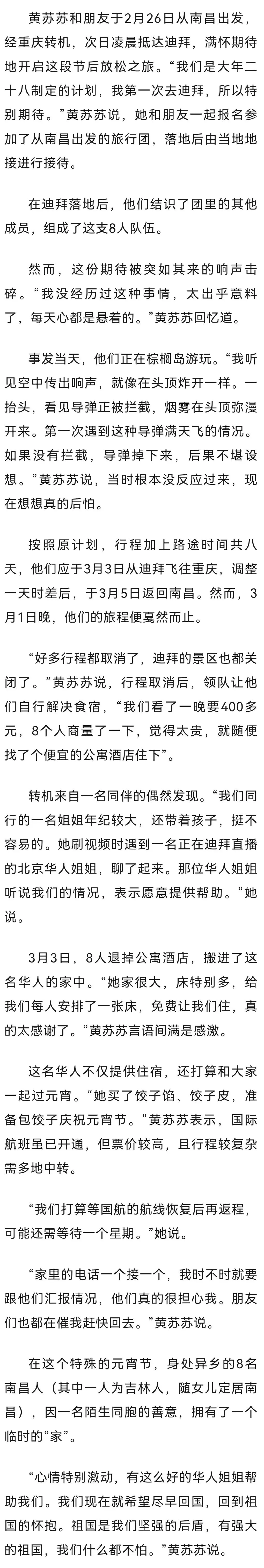 3月3日,元宵节。这一天,黄苏苏和她的7名旅伴本应结束8天的迪拜之旅,踏上回国的航班。此刻他们聚集在一名素不相识的华人家里,在距离祖国数千公里的异乡,等待未知的归期。