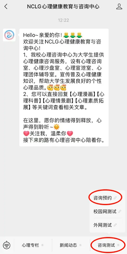 关注“NCLG心理健康教育与咨询中心”公众号,点击“咨询测试”-“咨询预约”,或者扫描下方小程序码,进行预约登记。
