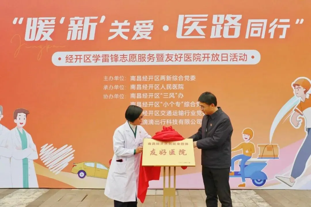 在热烈掌声中,市委社会工作部副部长周振波与南昌经开区人民医院党支部书记邓继红共同为“南昌经开区新就业群体友好医院”揭牌。随后,出席领导为现场新就业群体代表发放暖心健康礼包,将急救医用品与健康关怀送到一线劳动者手中。