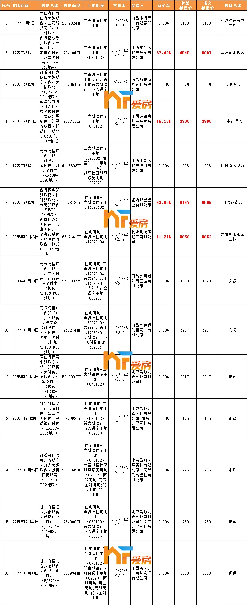 去年,南昌主城区总共成交了16宗住宅用地,底价成交的为10宗。其中,溢价率前3高的依次为邦泰观潮起地块(溢价率42.65%,楼面价9509元/㎡),建发朝阳观云地块(溢价率37.6%,楼面价9007元/㎡)和江来37号院地块(溢价率15.15%,楼面价3800元/㎡)。市政兜则底了4宗地块,交投则拿了2宗、江铃1宗。