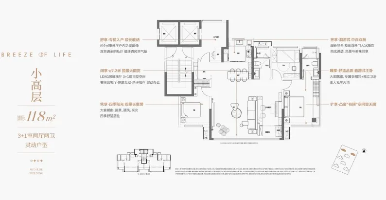 项目容积率仅1.5,共规划7栋住宅,其中2栋17F的小高,5栋11F的洋房,小高为118㎡3+1房,洋房为128㎡四房。
