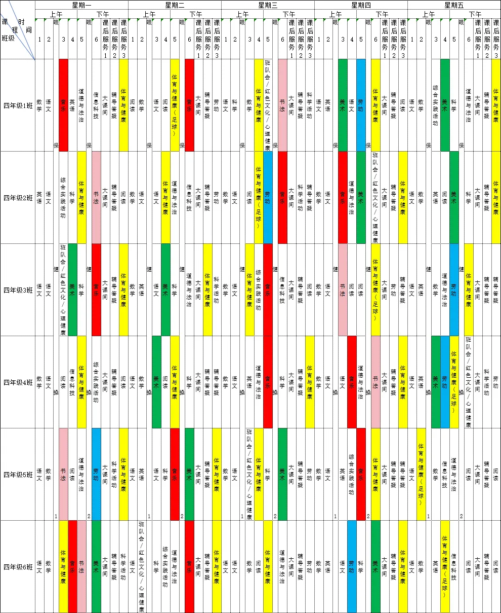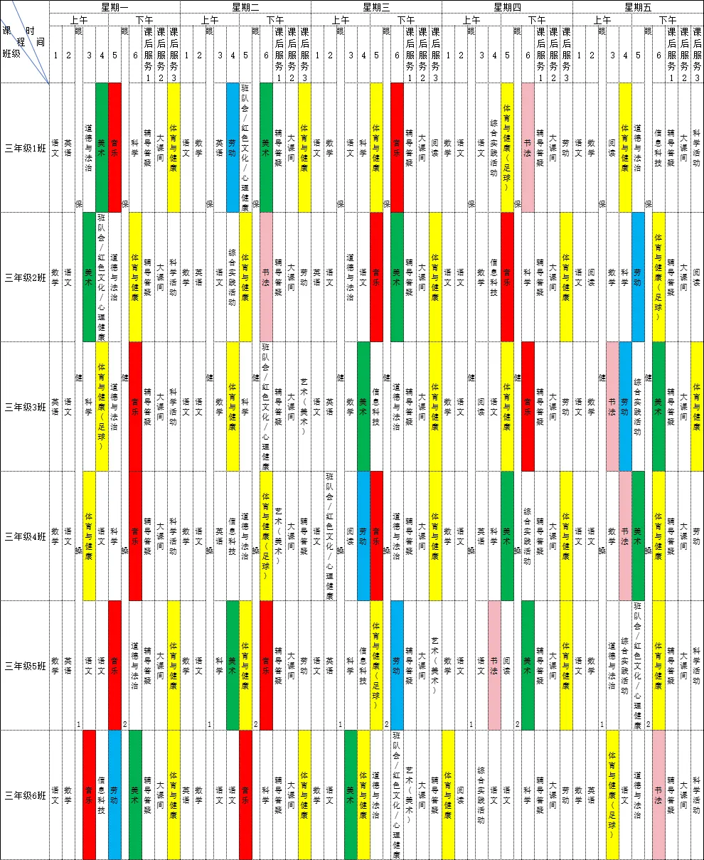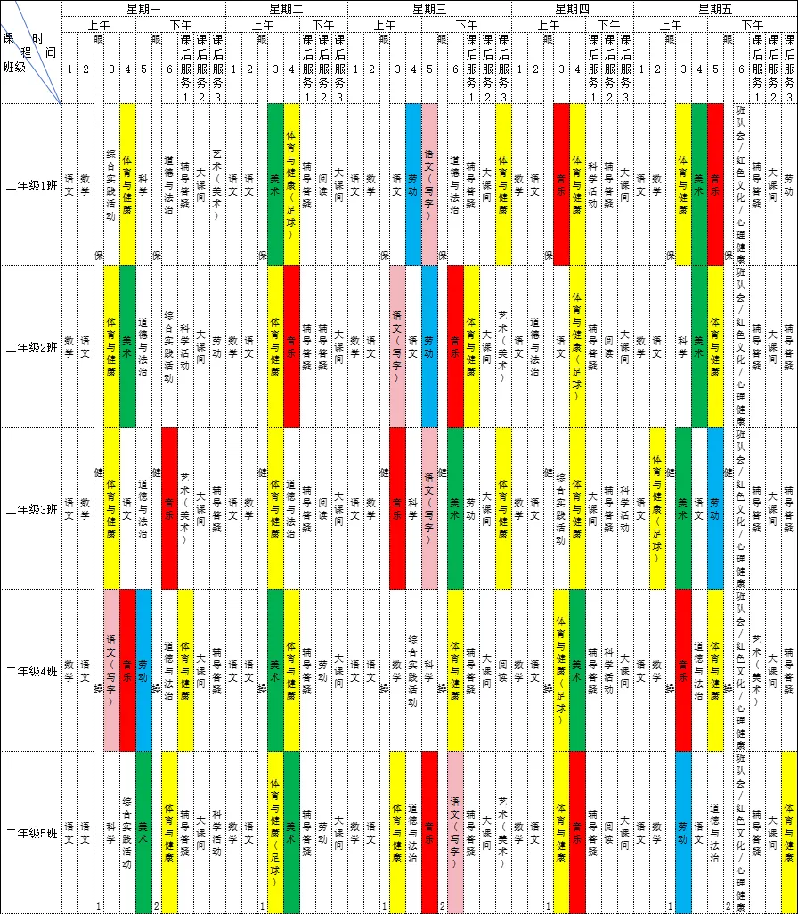 为深入贯彻落实《中共江西省委 江西省人民政府关于全面加强新时代大中小学劳动教育的实施意见》、《中共江西省委办公厅 江西省人民政府办公厅印发<关于全面加强和改进新时代学校体育工作的实施方案>和<关于全面加强和改进新时代学校美育工作的实施方案>的通知》等文件精神,我校严格落实国家课程方案和课程标准刚性要求,开足开齐体美劳课程,不减少、挤占体美劳教育课时,规范开展义务教育课后服务工作。现将2025-2026学年第二学期学校总课程表对家长进行公示,接受家长和社会监督,进一步推动落实“五育并举”。