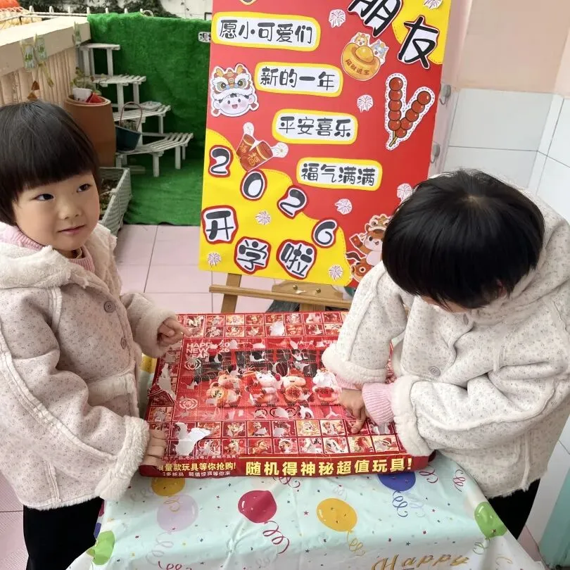幼儿园里年味与春意交织,处处洋溢着温暖与欢喜。老师们早早等候,用微笑与拥抱迎接每一位宝贝,小小的礼物藏着马到成功、平安喜乐的祝福,重逢的喜悦瞬间填满校园。