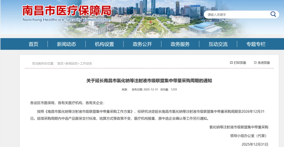 昨天,老汤和朋友探讨他家大输液产品在江西市场销售情况时发现一个奇怪的现象,他家氯化钠注射液和葡萄糖注射液虽然在《南昌市氯化钠等注射液市级联盟集中带量》中标了,但是看公布的医疗机构报量清单中,报量为0。朋友说投标价格不能说最低也算次低,也搞不清楚为啥一点报量也没有?我想说的是这无非2个原因:一方面可能他家产品上的晚且在江西省没有人员推广医院不知道未使用过在勾量过程中未报量;另一方面可能公司为重视该标的(或者没有搞太明白)未能与商业提前沟通协助勾量。不管什么原因,集采到期后再次报量还有机会(前提是采取正确策略,否则也是白搭)。既然说到这个标的了,老汤就带各位同行关注一下该标的的最新情况及对他的前世今生和我对该标的的个人看法,然后再次分享一下产品的具体情况。据官网最新消息,南昌市氯化钠等注射液市级联盟集采发布延长采购周期通知,将原一年采购周期延长至 2026 年 12 月 31 日。作为覆盖江西全省 11 个设区市的基础输液大联盟集采,其政策延续、执行节奏、企业要求都备受关注。
