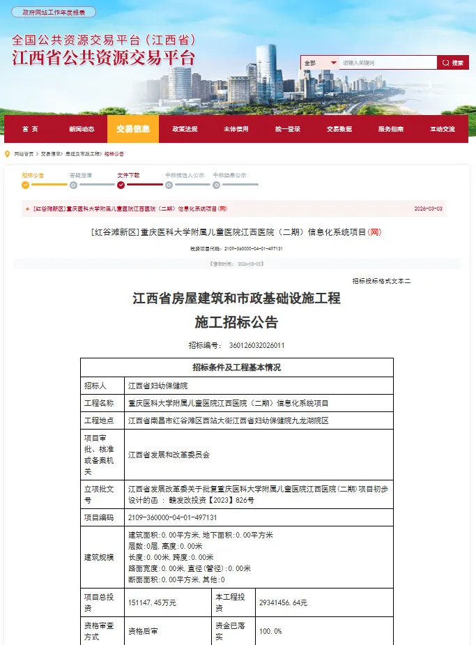 医院启用后仅三天,3月3日,江西省公共资源交易平台发布了一份新的招标公告:重庆医科大学附属儿童医院江西医院(二期)信息化系统项目,开始公开招标。