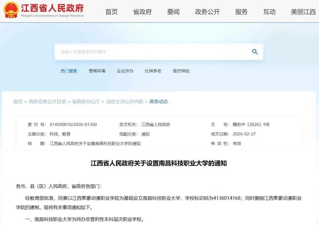 经教育部批准,同意以江西泰豪动漫职业学院为基础设立南昌科技职业大学,学校标识码为4136014168;同时撤销江西泰豪动漫职业学院的建制。现将有关事项通知如下。