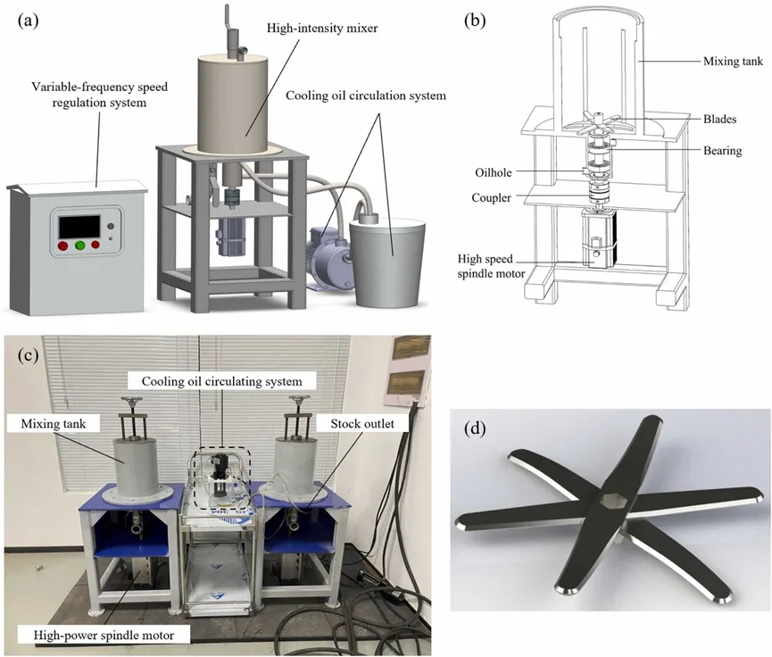 图1. 水泥浆制备系统:(a)高强度混合装置的概念模型;(b)混合装置的结构;(c)高强度混合装置;(d)混合刀片