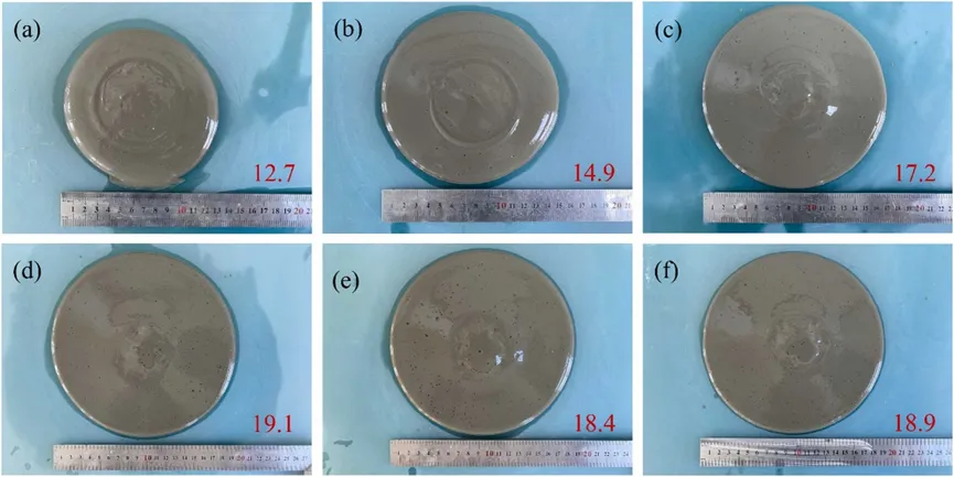 图3.新拌水泥浆的流动性:(a)对照组;(b)-(f) 测试组,混合速度分别为500、1000、2000、3000和4000转/分钟