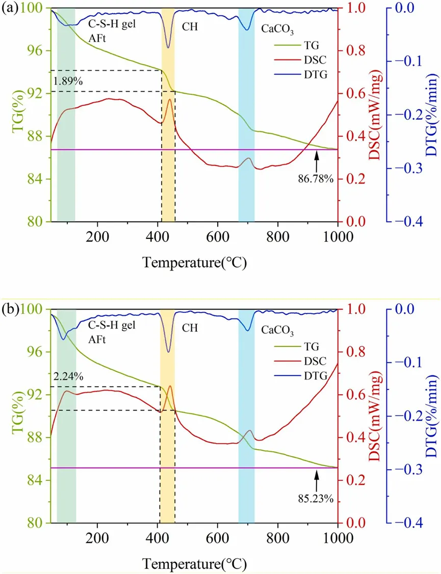 图5.对不同混合方法制备的水泥浆样热重分析:(a)传统混合;(b)高强度混合