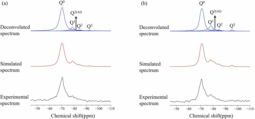 图6.对不同混合方法制备的水泥浆样品进行29Si核磁共振分析:(a)常规混合;(b)高强度混合