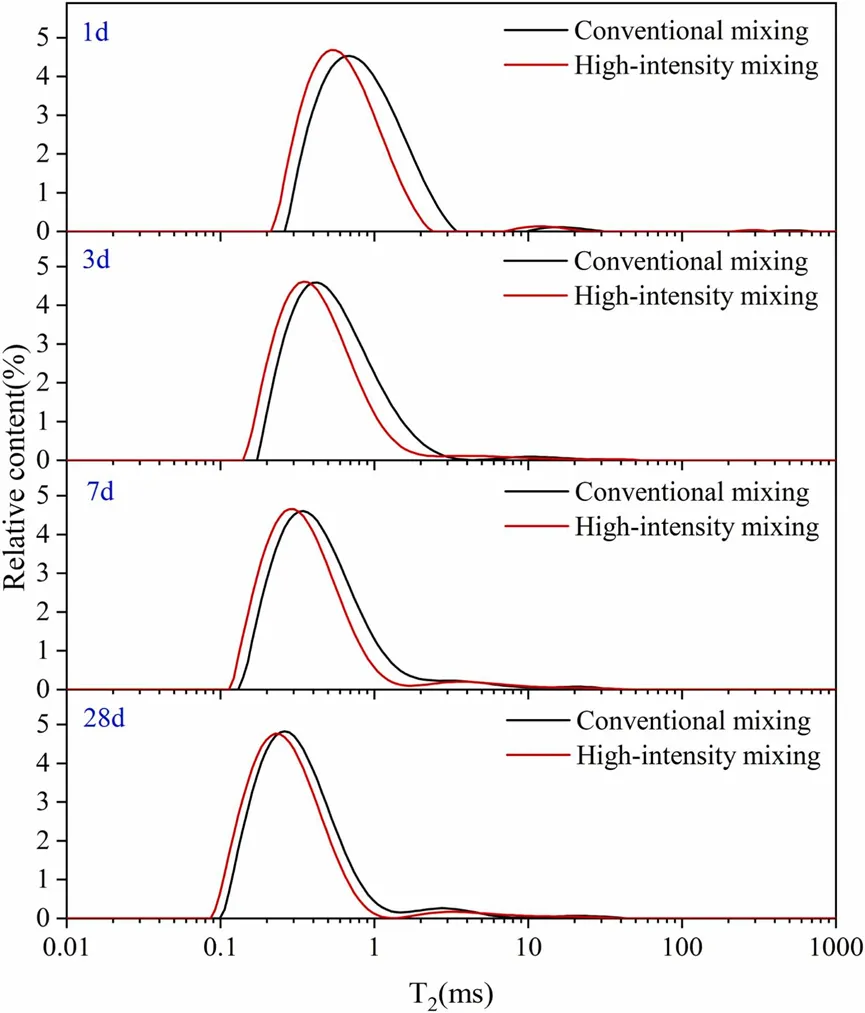 4.与常规搅拌方法相比,高强度搅拌方法制备的水泥净浆中主峰分布范围对应的横向弛豫时间 T₂ 更小,最优 T₂ 值更低,孔径更小,无害孔比例更高,少害孔、有害孔和多害孔的比例更低,水泥净浆的密实度更好,性能更优。