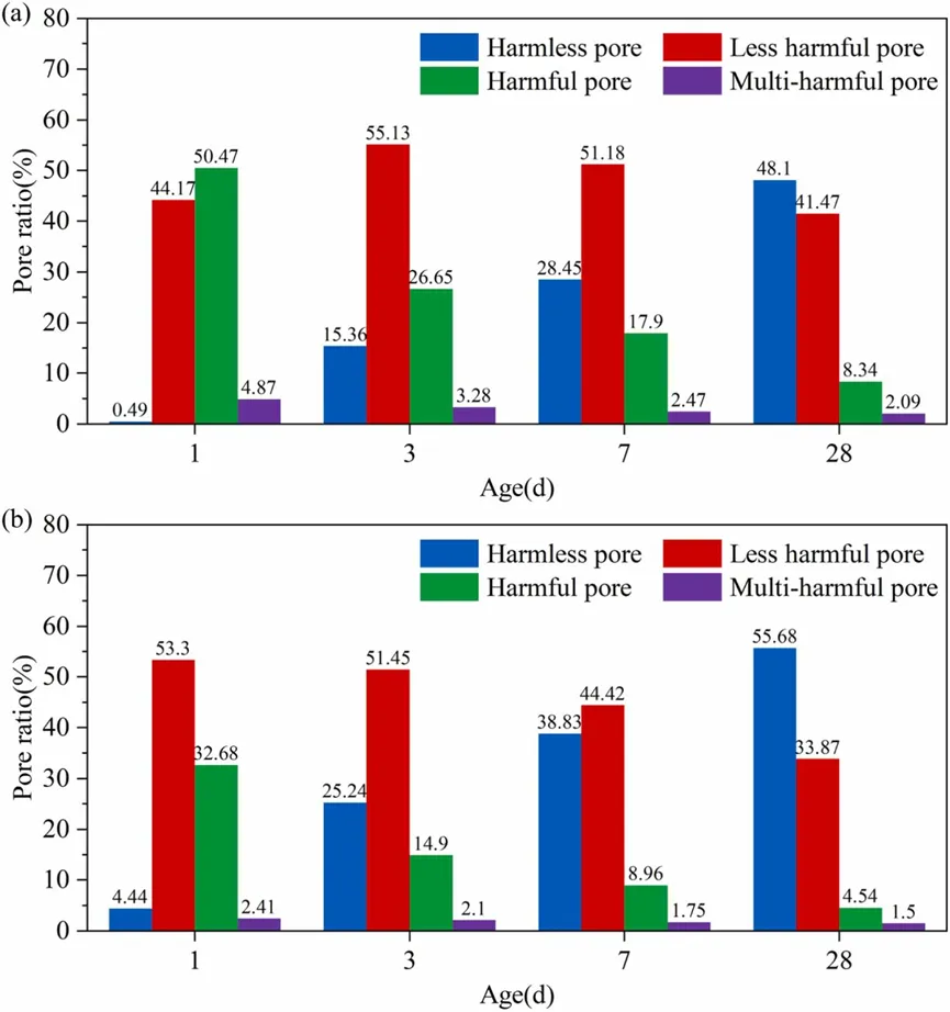 图8.水泥浆样品中通过两种混合方法制备的各个孔隙比例:(a)常规混合;(b)高强度混合