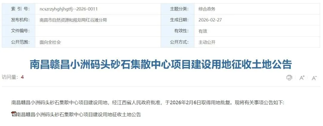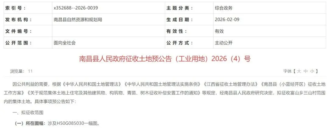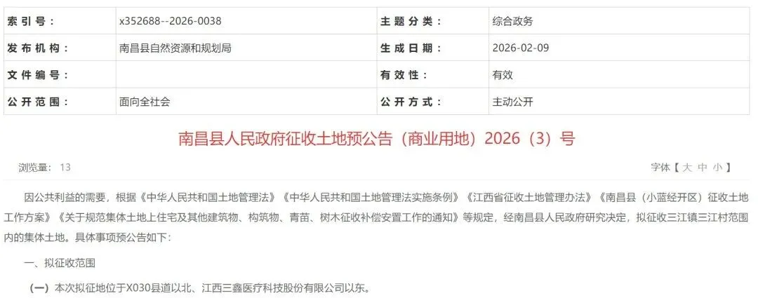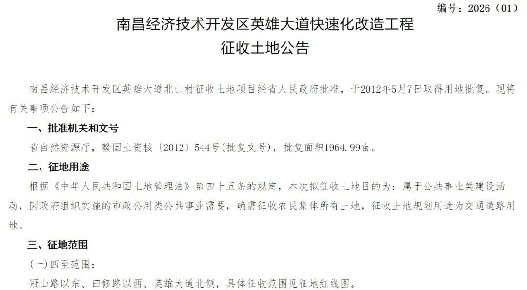 根据南昌县人民政府征收土地预公告(商业用地)2026(3)号公告显示,拟征收三江镇三江村范围内的集体土地。土地面积约17.2095亩。(最终面积以批准面积为准)。拟征地位于X030县道以北、江西三鑫医疗科技股份有限公司以东。涉及三江镇三江村东余组农民集体,具体以土地现状调查确认结果为准。本次拟征收土地目的为:经省人民政府批准由县人民政府组织实施的成片开发建设需要用地的,用于商业用地项目建设。此外,南昌经济技术开发区公布了关于英雄大道快速化改造工程征收土地公告。征地范围为冠山路以东、曰修路以西、英雄大道北侧。征地涉及白水湖管理处北山村,共1管理处1村委会。经调查确认,本次征地总面积2.05亩,其中:农用地2.05亩。