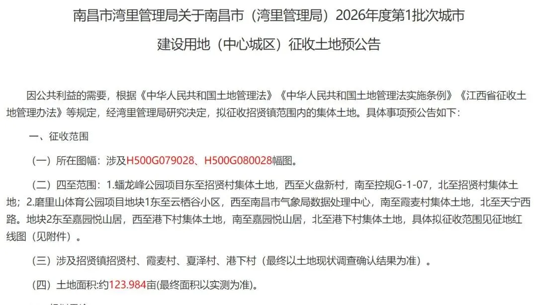 本次拟征收土地属于公共事业类建设活动,因政府组织实施的市政公用类公共事业需要,确需征收农民集体所有土地,征收土地规划用途为交通道路用地。湾里管理局公布了关于南昌市(湾里管理局)2026年度第1批次城市建设用地(中心城区)征收土地预公告。四至范围为:蟠龙峰公园项目东至招贤村集体土地,西至火盘新村,南至控规G-1-07,北至招贤村集体土地;