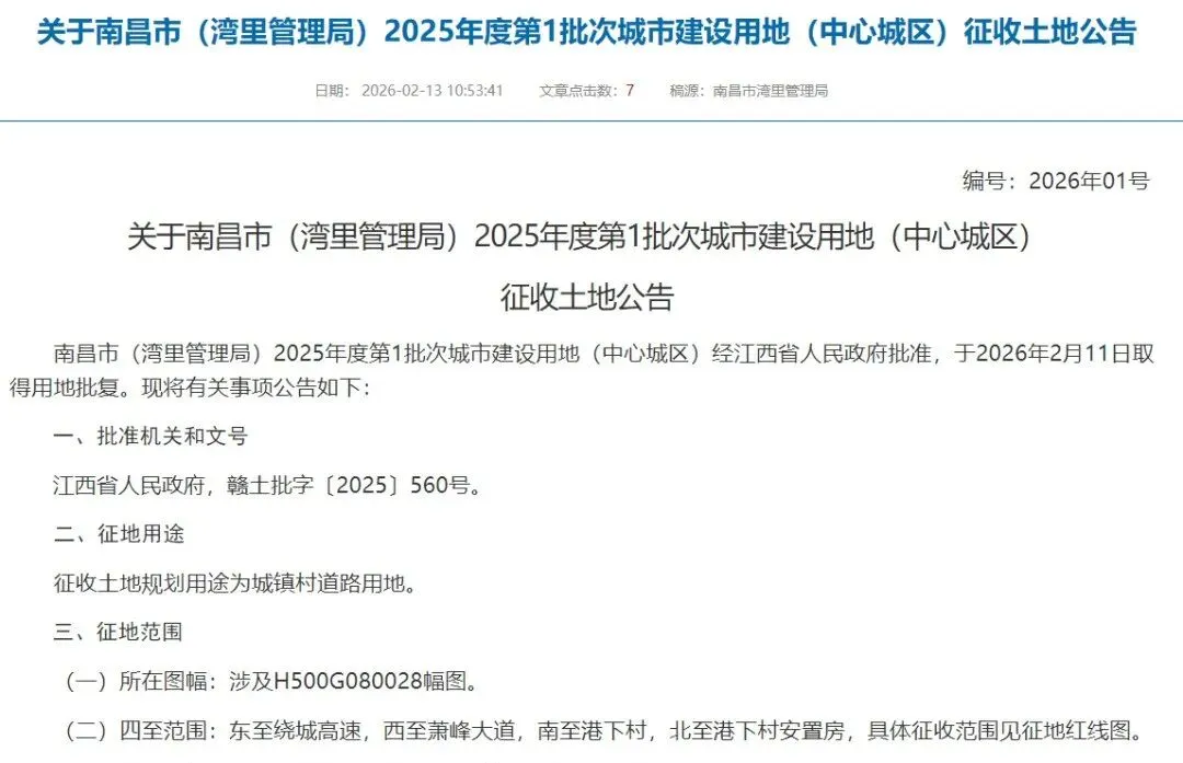 南昌市(湾里管理局)2025年度第1批次城市建设用地(中心城区)经江西省人民政府批准,于2026年2月11日取得用地批复。